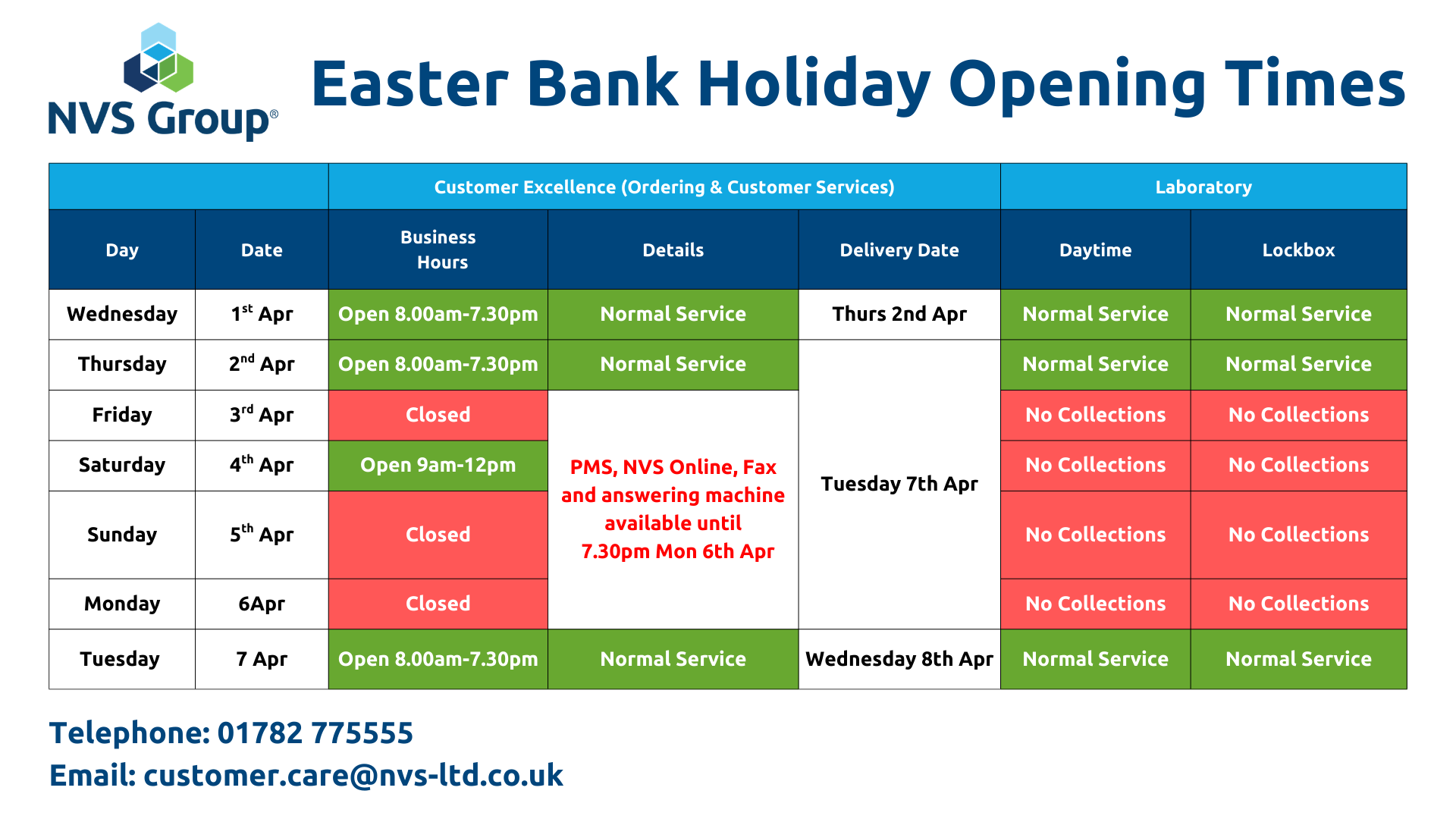 | Friday 3rd Apr | Closed | PMS, NVS Online, Fax and answering machine available until 7.30pm Mon 6th Apr | No collections | ||