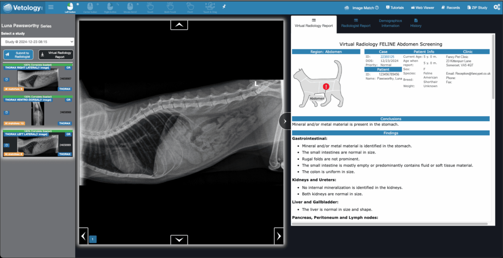 This combination provides fast, AI-generated insights to support veterinary practices in timely decision-making while also giving them access to expert radiologists for in-depth guidance when needed.