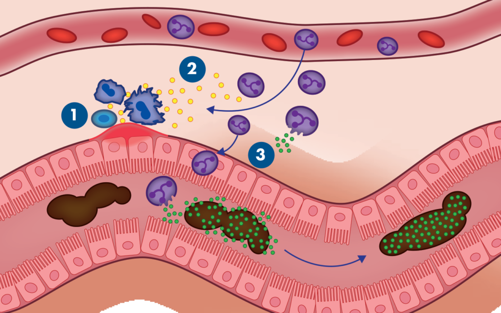 Calprotectin makes up around 60 percent of the neutrophil’s cytosol (fluid within a cell’s cytoplasm). Neutrophil disintegration therefore results in calprotectin being released into the gut lumen, where it enters the faecal stream, and can then be measured.2,4