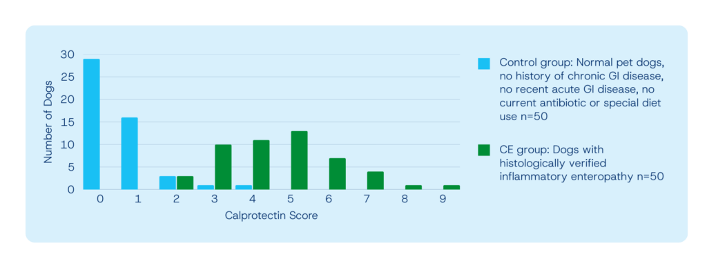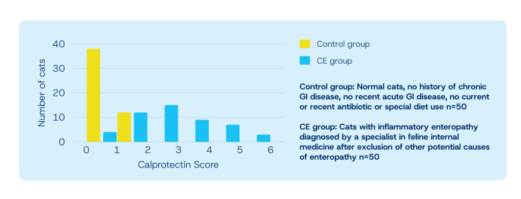 In the University of Bristol study, faecal calprotectin concentrations showed a clear distinction between 50 cats with confirmed chronic enteropathy and 50 clinically healthy controls (Figure 3).