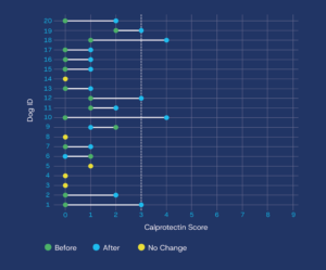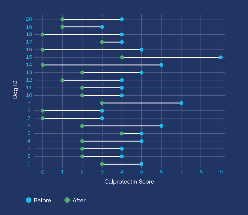 All dogs had calprotectin levels in the inflammatory range (≥3 mg/kg) prior to diet trial (mean pre-treatment score: 4.7). Following dietary management, all dogs had reduced levels of calprotectin and 75% had calprotectin levels that returned to the normal or borderline range (mean post-treatment score: 1.7).