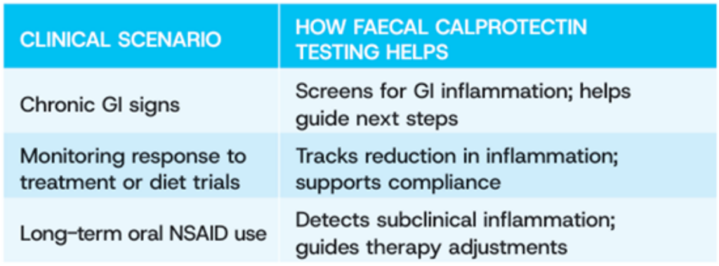 While faecal calprotectin does not replace histopathology, it may help refine the diagnostic pathway and inform timely, evidence-based decisions. It can also provide clinicians and owners with a clearer understanding of what is driving GI signs, supporting shared decision-making throughout the diagnostic and treatment process.