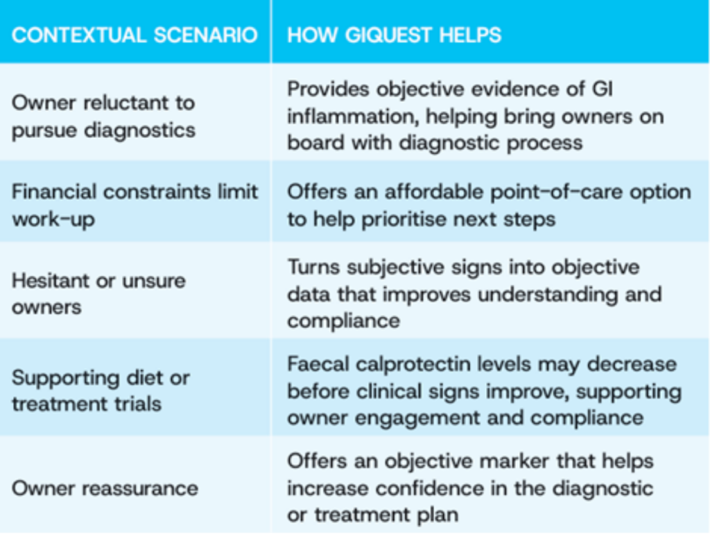 GIQuest is a patient-side lateral flow faecal calprotectin test, helping to guide next steps in dogs and cats with chronic GI conditions, including chronic enteropathy (CE; previously termed inflammatory bowel disease or IBD), food-responsive enteropathy (FRE) and GI side effects associated with oral non-steroidal anti-inflammatory drug (NSAID) use (Table 1).