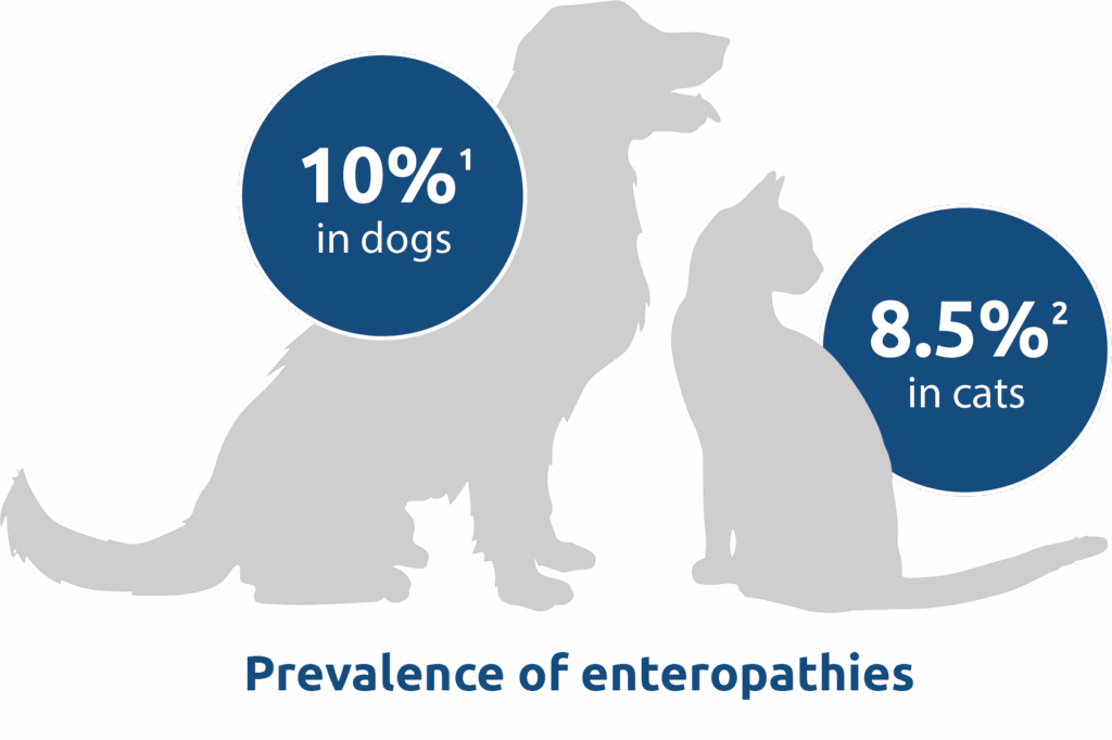 Gastrointestinal disorders are another highly seen condition, with the prevalence of enteropathies in dogs reported to be 10%3 and in cats approximately 8.5%4. Whereas historically, antibiotics were heavily prescribed in cases of diarrhoea, we now know that most acute cases of diarrhoea are not caused by pathogenic bacteria5. Instead we have seen a shift to treating dysbiosis with dietary modifications and nutraceuticals.