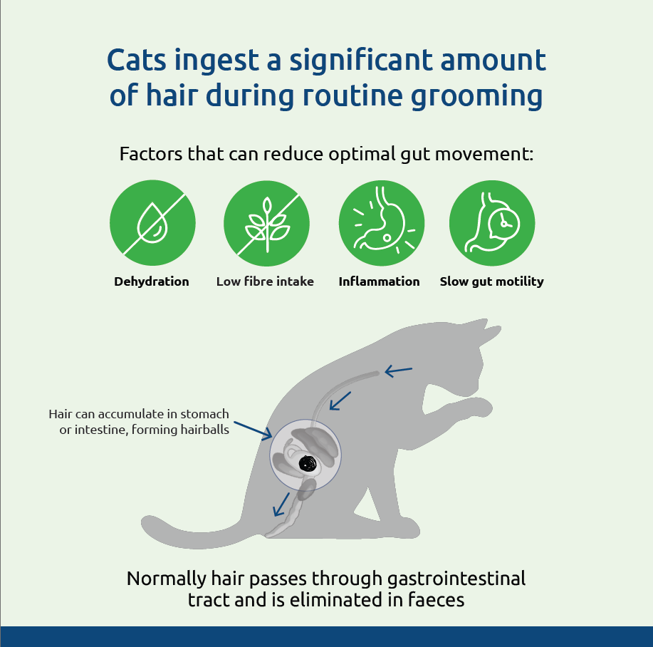Additional gut mobility support may be required to ensure efficient transit or hair and to prevent accumulation. Nutritional supplements that help lubricate the digestive tract and promote gentle mobility, such as Movipet, can be highly effective.