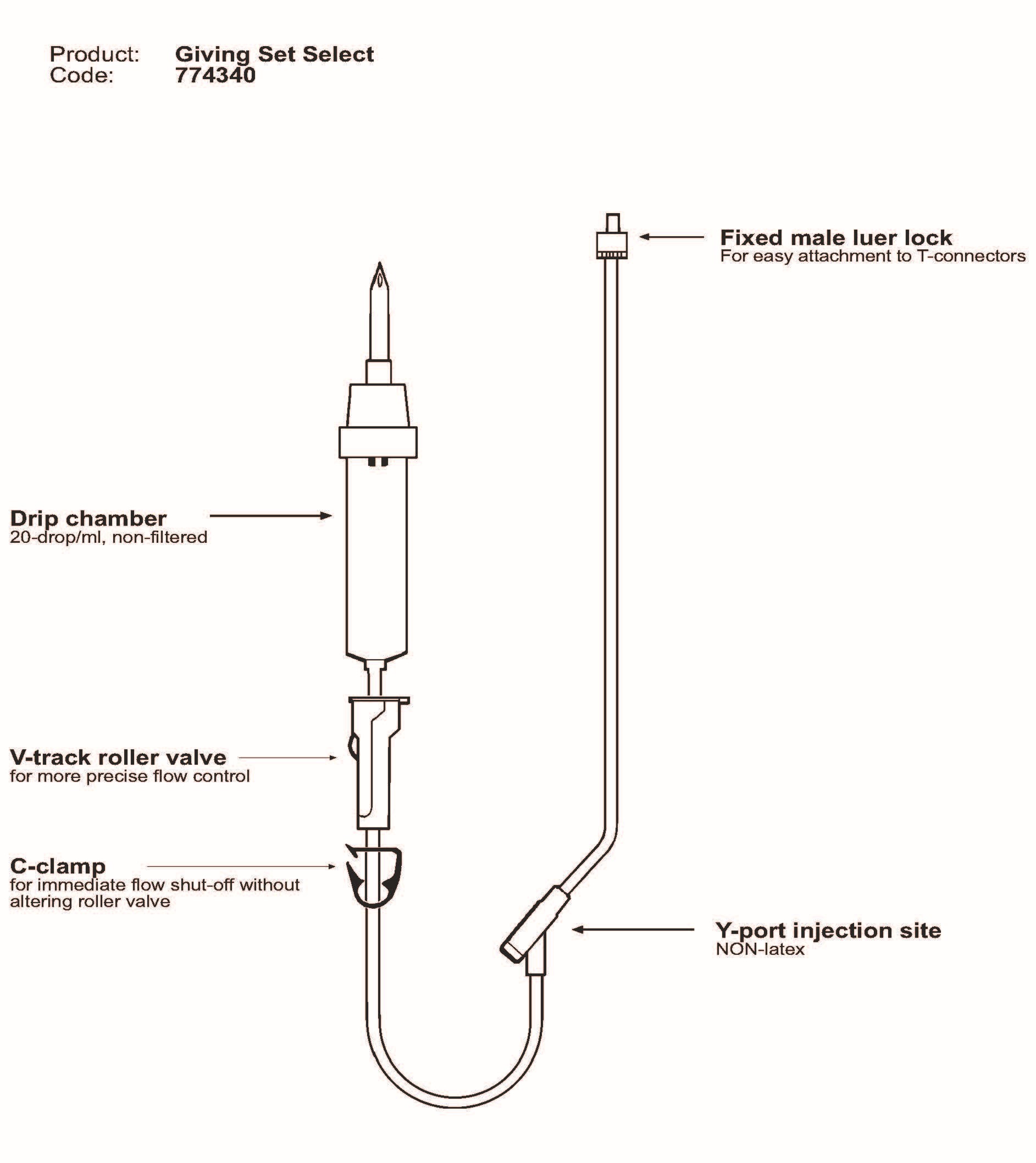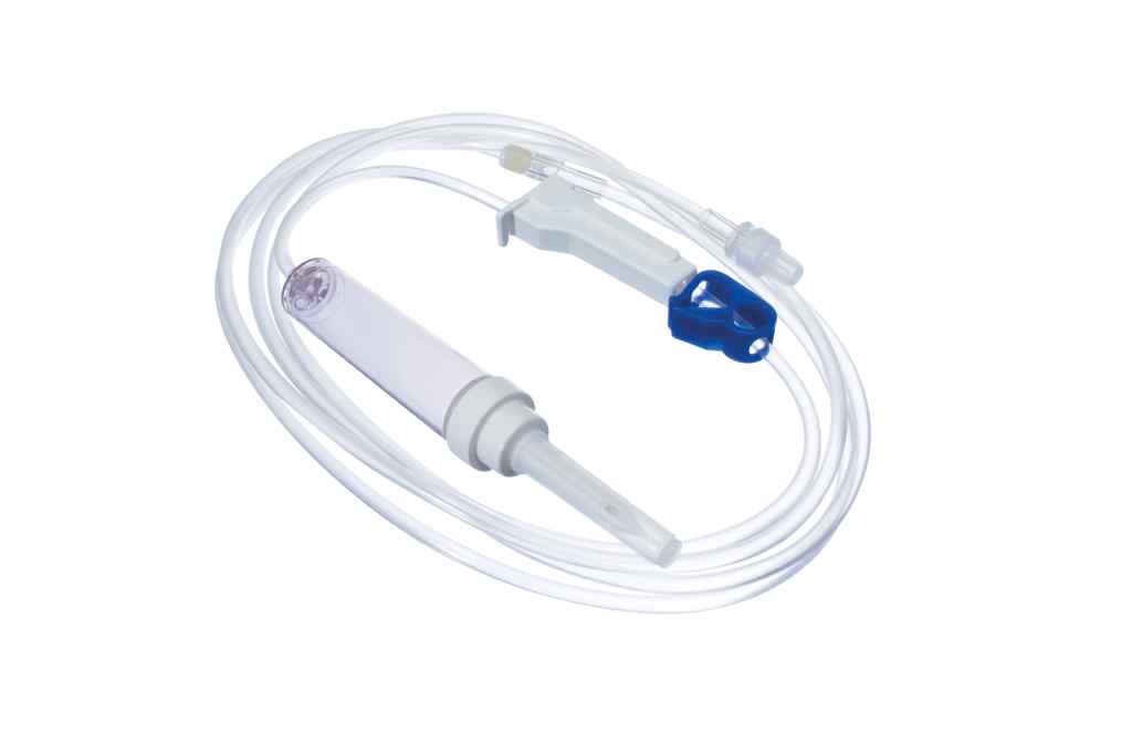 A standard non-pump compatible giving set with a non-filtered 20 drops/ml drip chamber. Includes V-track roller valve for more precise flow control and a C-clamp for immediate flow shut off.
