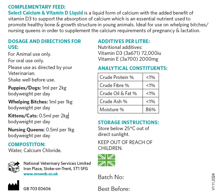 Calcium & Vitamin D Liquid is a liquid form of calcium with the added benefit of vitamin D3 to support the absorption of calcium which is an essential nutrient used to promote healthy bone & growth structure in young animals. Ideal for use on whelping bitches/ nursing queens in order to supplement the calcium requirements of pregnancy & lactation.