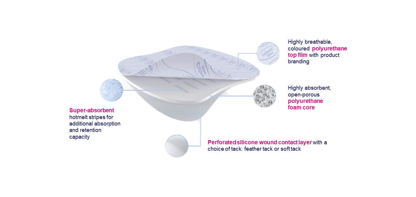 Secure, comfortable, conformable. Cutimed Siltec products are designed for atraumatic dressing changes with minimised pain and to protect against odour. Additionally, the border products are fully water resistant. Skin protection with a feather tack. Excellent exudate management.