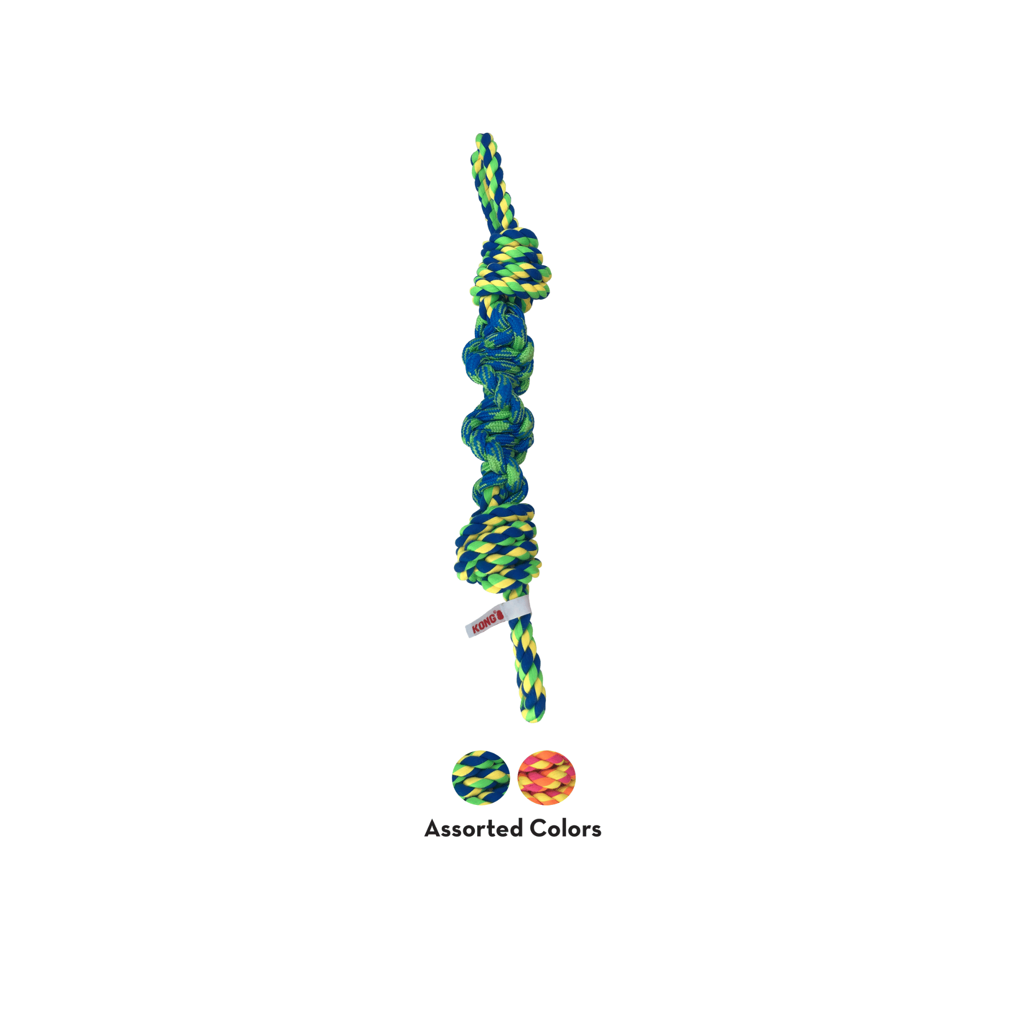 KONG Rope Bunjiโs internal elastic bungee cord adds dynamic spring for extra-fun tugging and tossing with this durable, knotted, twisted rope toy. Two easy-grab loops deliver interactive ease while the bungee softens the tugging motion. Ideal for indoor and outdoor action.