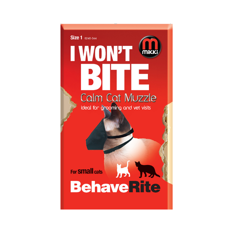 Cats typically do not like things on their face and will try to paw it off as soon as the muzzle is placed on. Our muzzle has a secure head harness to help keep the muzzle in place.