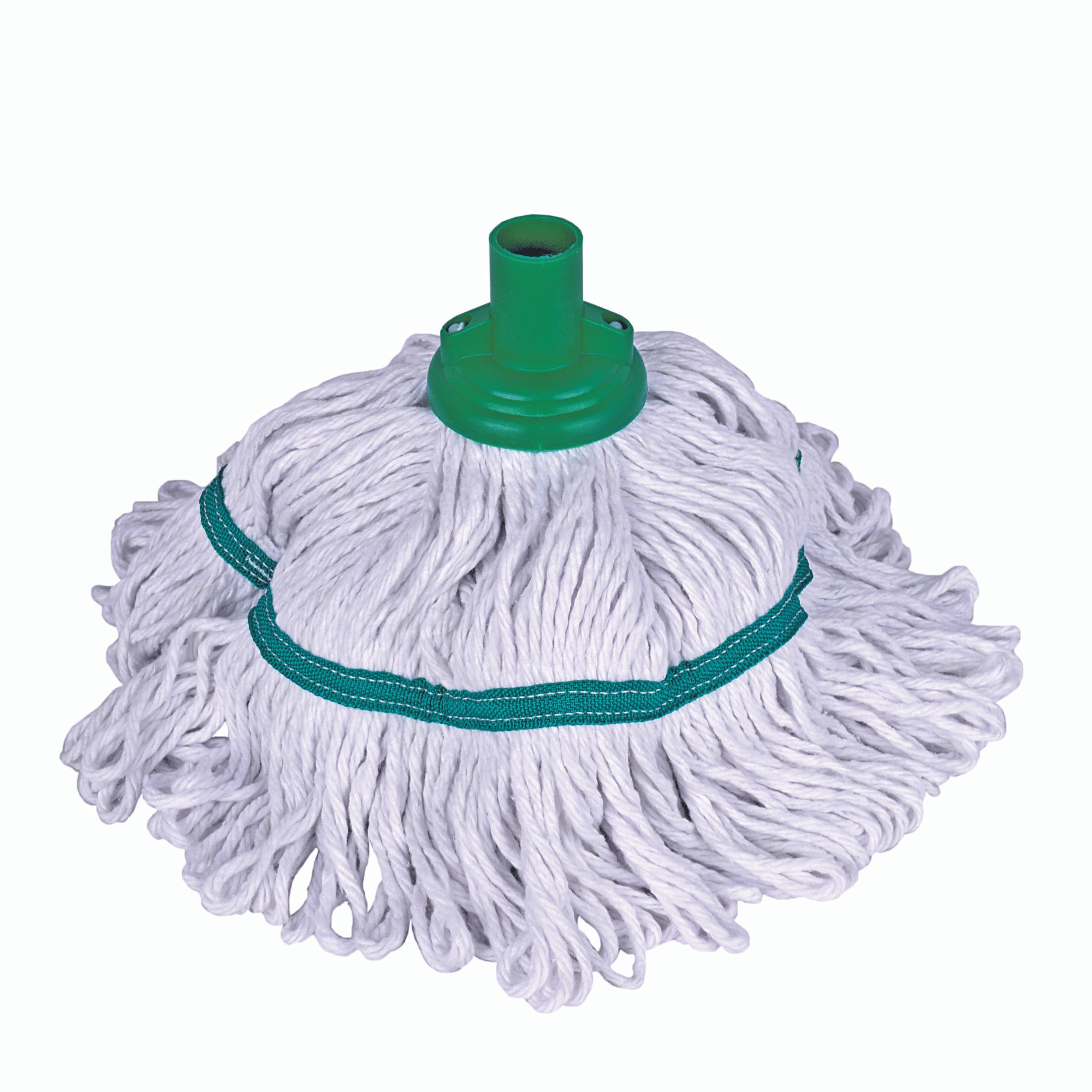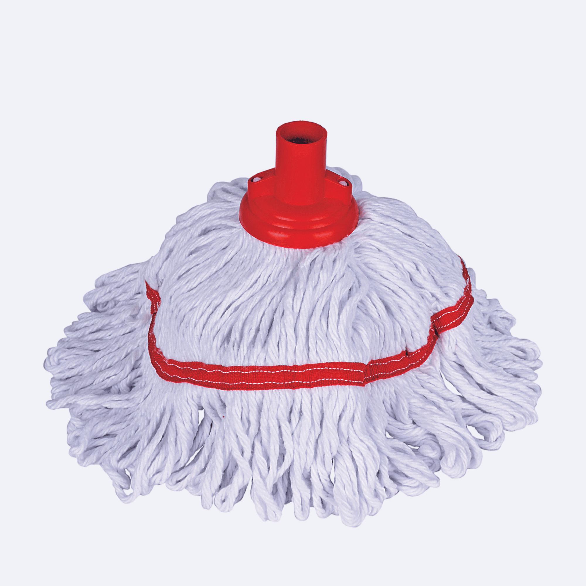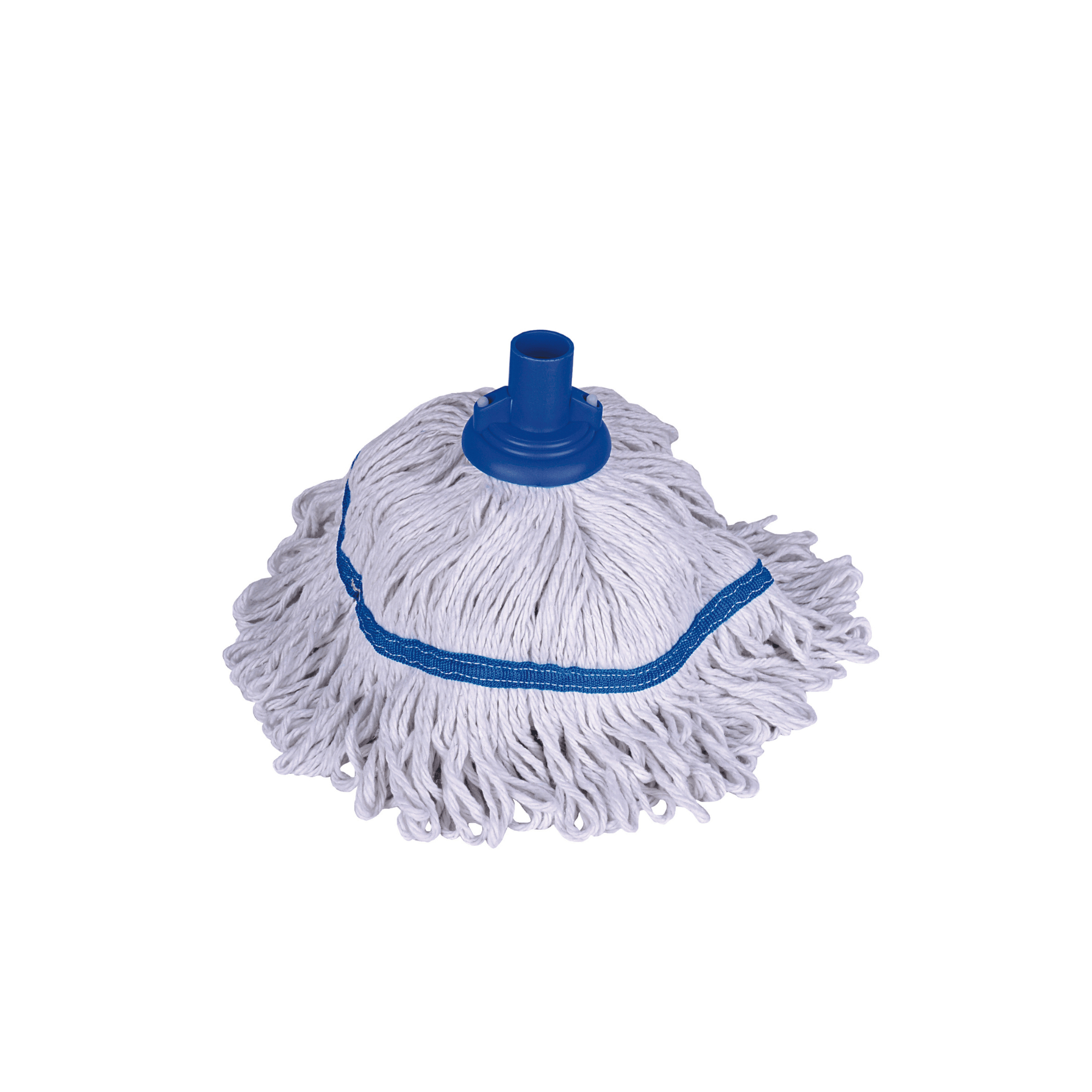 A hardwearing mop made from a unique blend of bleached cotton and synthetic yarns. The stay flat band holds the shape enabling the mop to cover a larger floor area, whilst the looped end yarn prevents linting and the yarn tangling in use. Made from a unique blend of polyester and cotton yarns for improved strength and absorbency. The socket fits our hygiene handle and alternative push fit handles. Washable up to 60 degrees.
