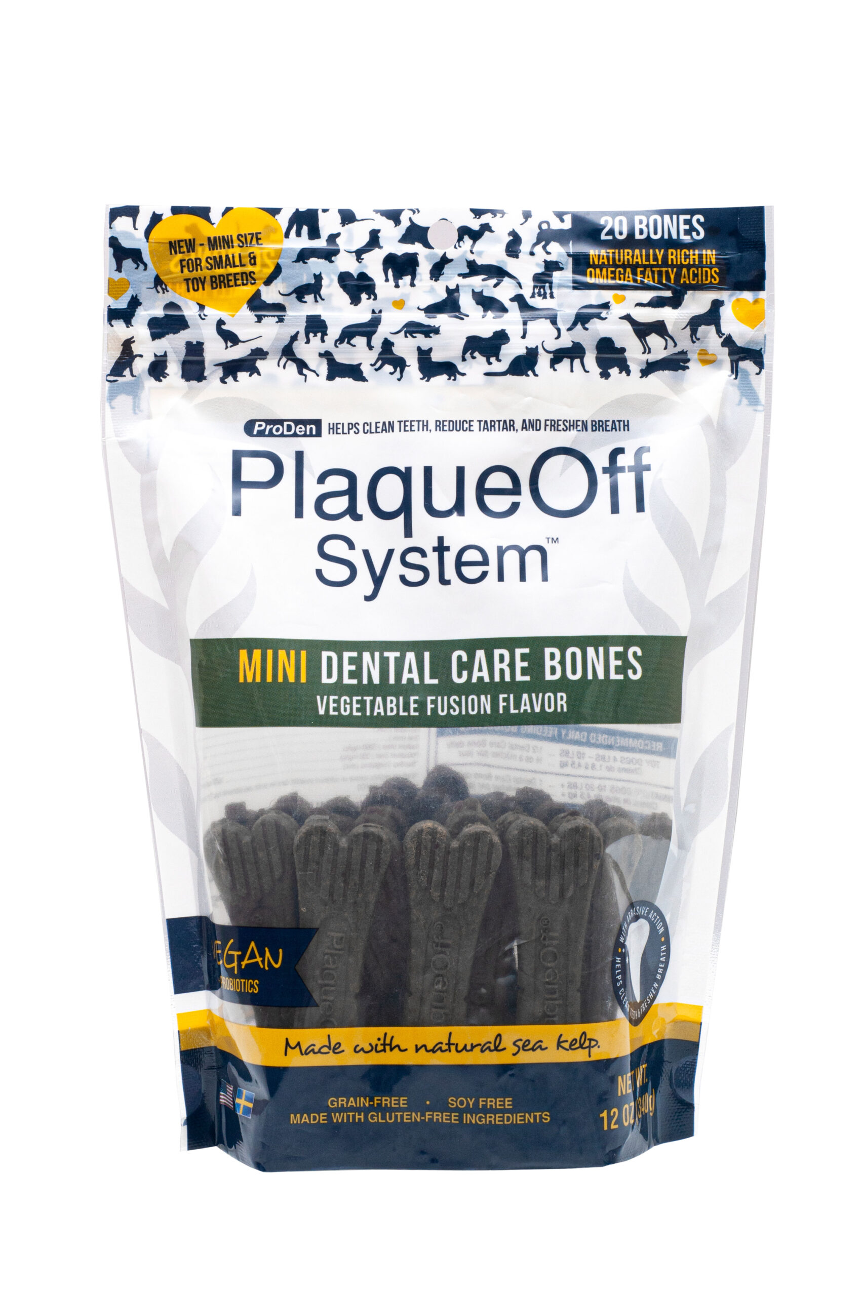 ProDen PlaqueOff Mini Dental Care Bones are chews developed for small dog breeds. Just as our regular Bones, the Miniโs are the only chews on the market that contain the 100% natural and clinically proven seaweed ingredient A.N ProDenยฎ. The Mini Bones help oral problems with double action โ A.N ProDenยฎ and the boneโs unique shape and abrasive action help control and improve plaque and tartar from forming when used as directed, resulting in a fresher breath. They also contain omega 3 and 6 fatty acids and antioxidants that support immune health.