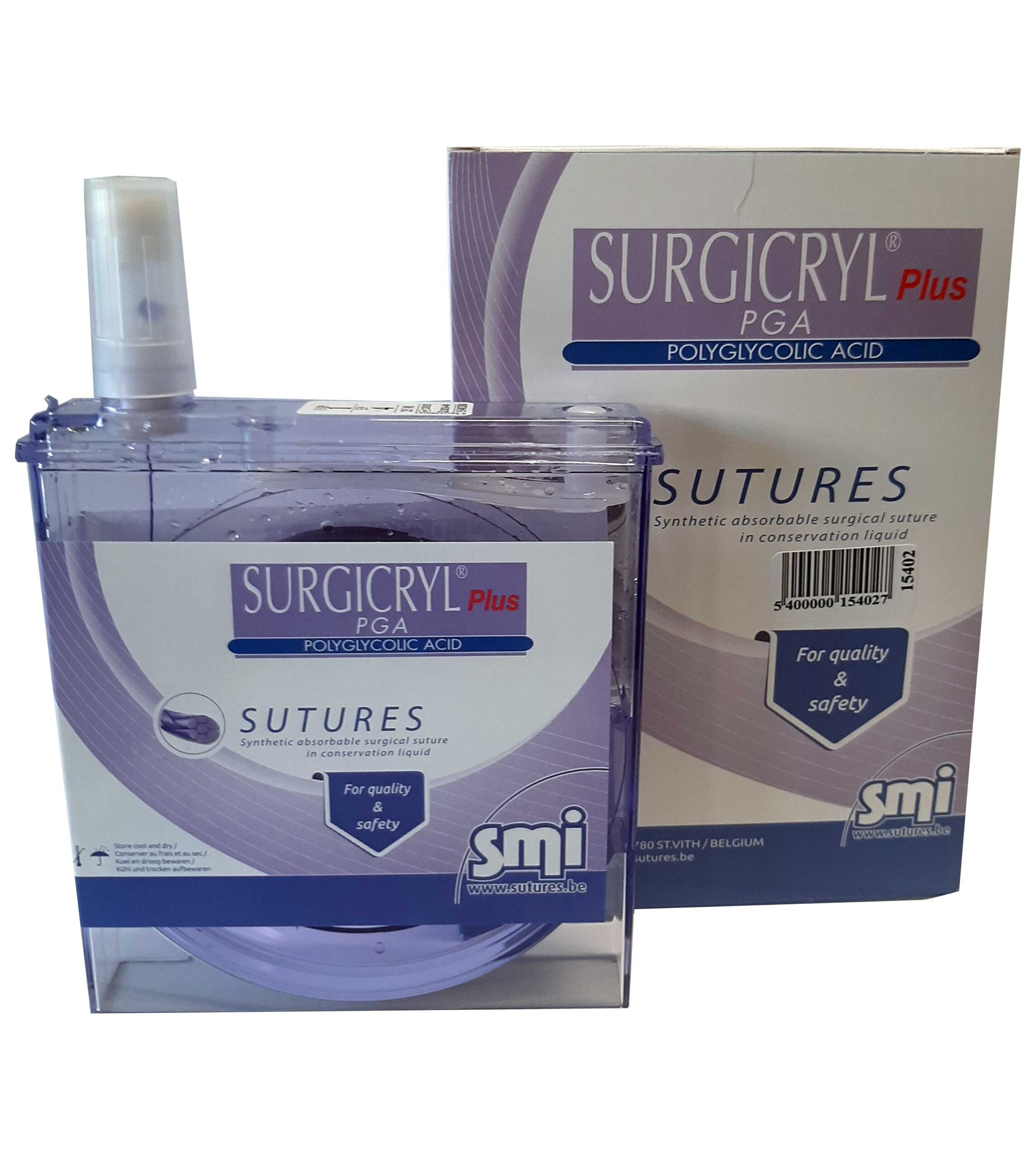 SURGICRYLยฎ PLUS POLYGLYCOLIC ACID multifilament violet IN CONVERSATION LIQUID with a resorption time of 50 to 70 days.