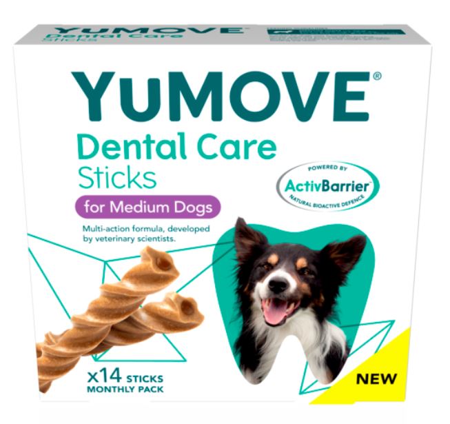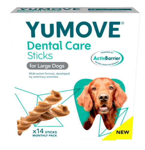 YuMove multi-action Dental Care Sticks are an innovative dental regime, developed by veterinary scientists to target plaque, freshen breath, and create a barrier along the teeth and gums helping preventing future gum health concerns. The fast-acting formula means you can expect to notice a difference in your dogโs mouth in just 4 weeks.