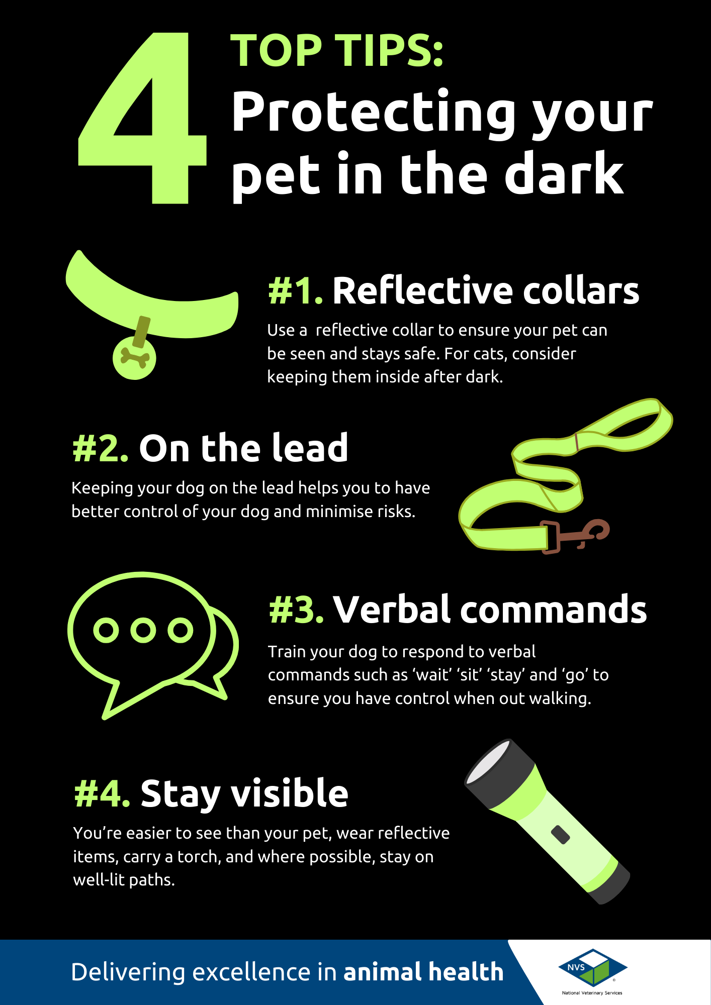 Shorter hours of daylight mean there is an increased risk of a pet not being seen in the darkness. Display this informative poster in your practice for some top tips to help your customers.